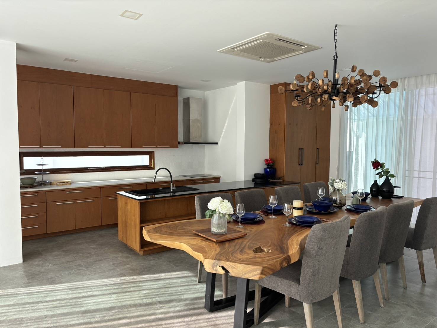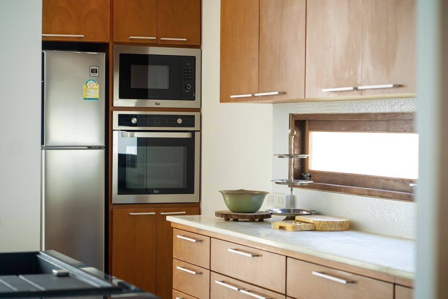 - 1 ห้องครัวสไตล์ฝรั่ง แบบโอเพ่น บิวอิน พร้อมอุปกรณ์ไฟฟ้าครบครัน เตาอบ เตาแก๊ส ไมโครเวฟ ตู้เย็น ชุดโต๊ะรับประทานอาหารไม้สักอย่างดี ชุดใหญ่